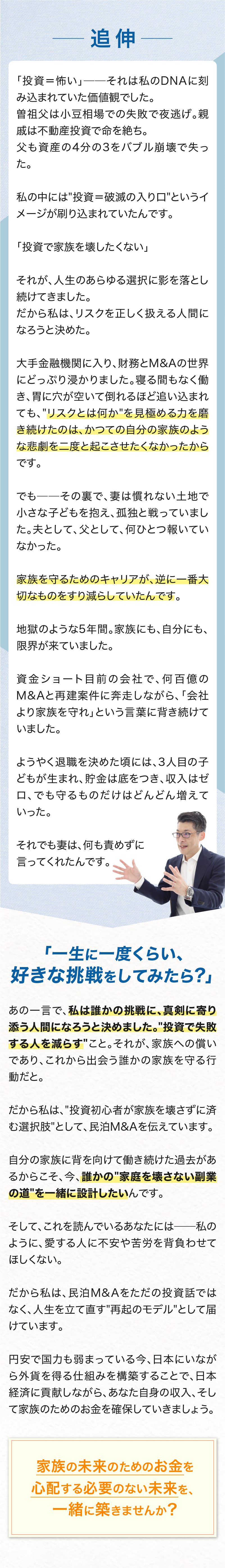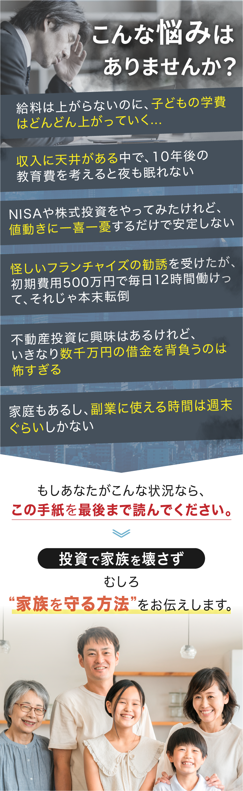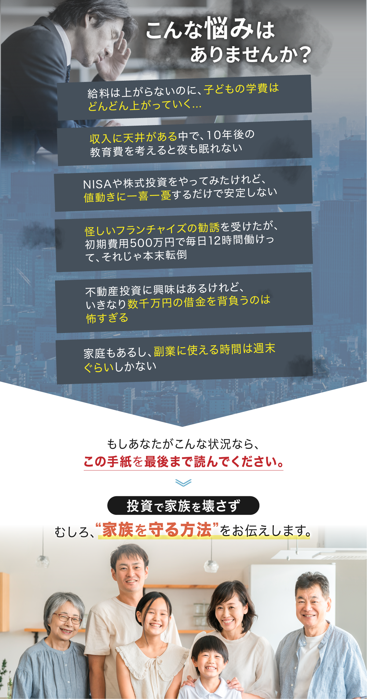 大手企業の会社員50代。出世レースからはずれて仕事では不完全燃焼。これ以上の出世も望めない。他の投資を探すも、月5万円の収入を得ることも難しい状態でした。しかし、田中先生からのアドバイスを受けて、400万円の自己資金で、たった3~4ヶ月でM&A。月10万~20万円の収入を得られるように。現在、2棟目のM&Aを検討中。