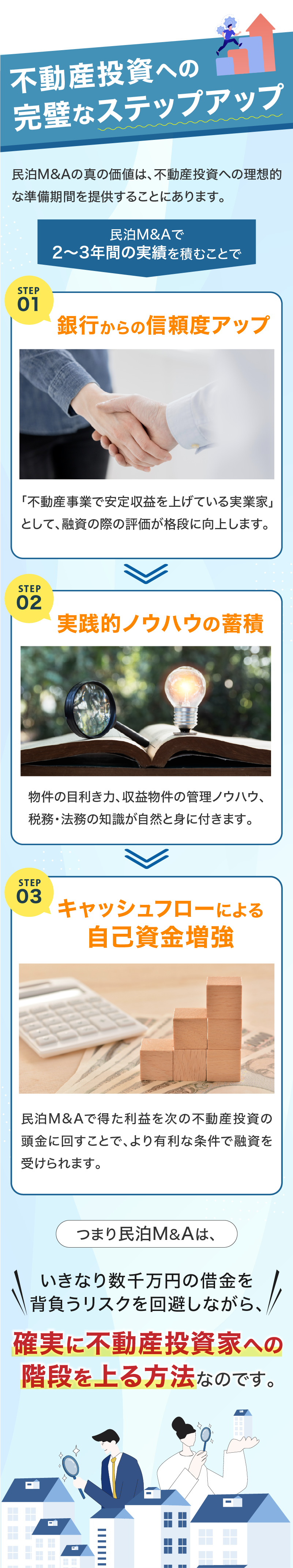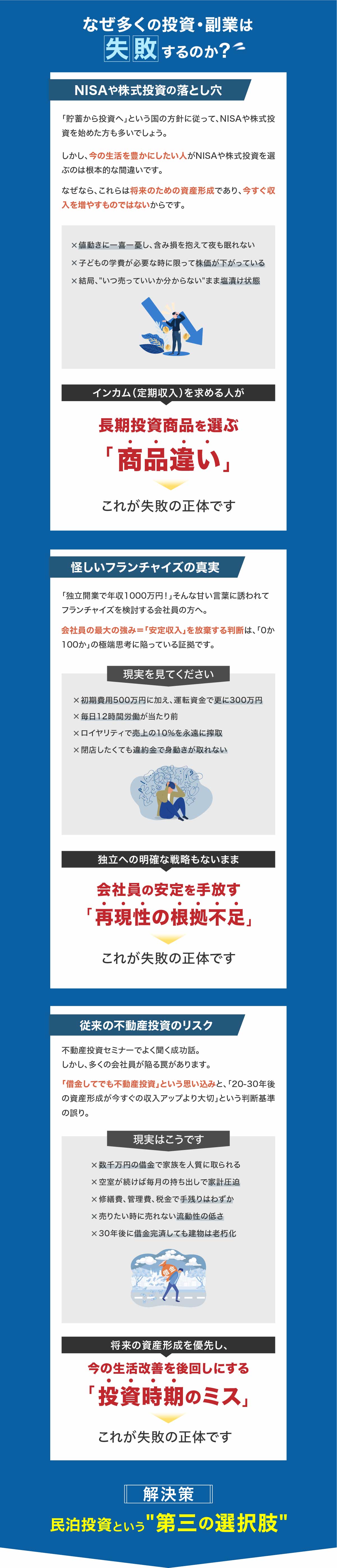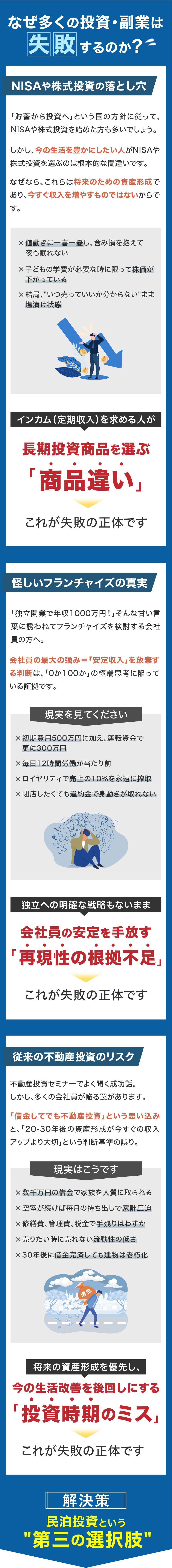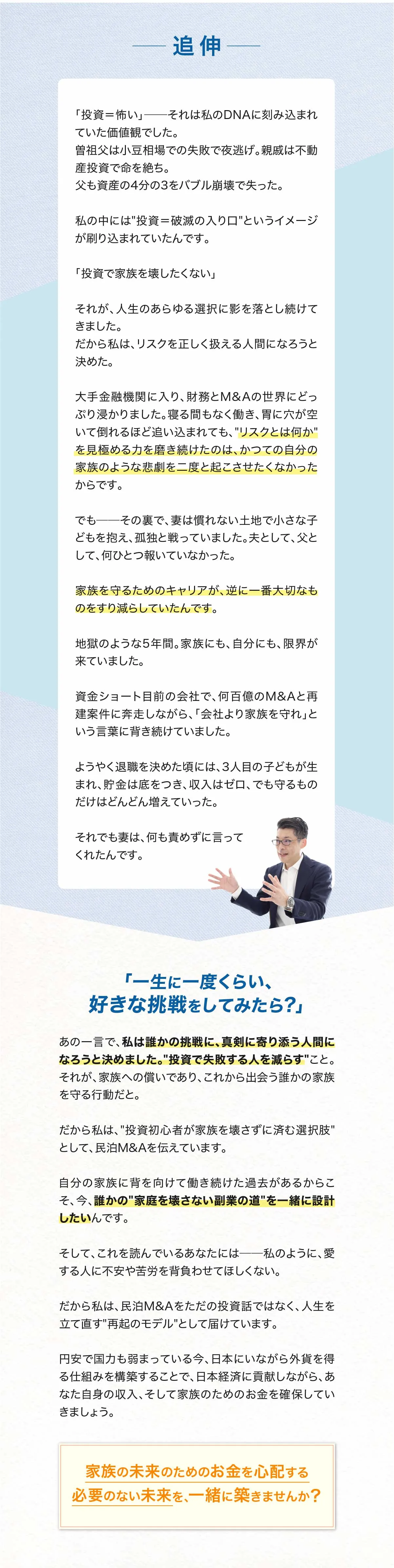 大手企業の会社員50代。出世レースからはずれて仕事では不完全燃焼。これ以上の出世も望めない。他の投資を探すも、月5万円の収入を得ることも難しい状態でした。しかし、田中先生からのアドバイスを受けて、400万円の自己資金で、たった3~4ヶ月でM&A。月10万~20万円の収入を得られるように。現在、2棟目のM&Aを検討中。