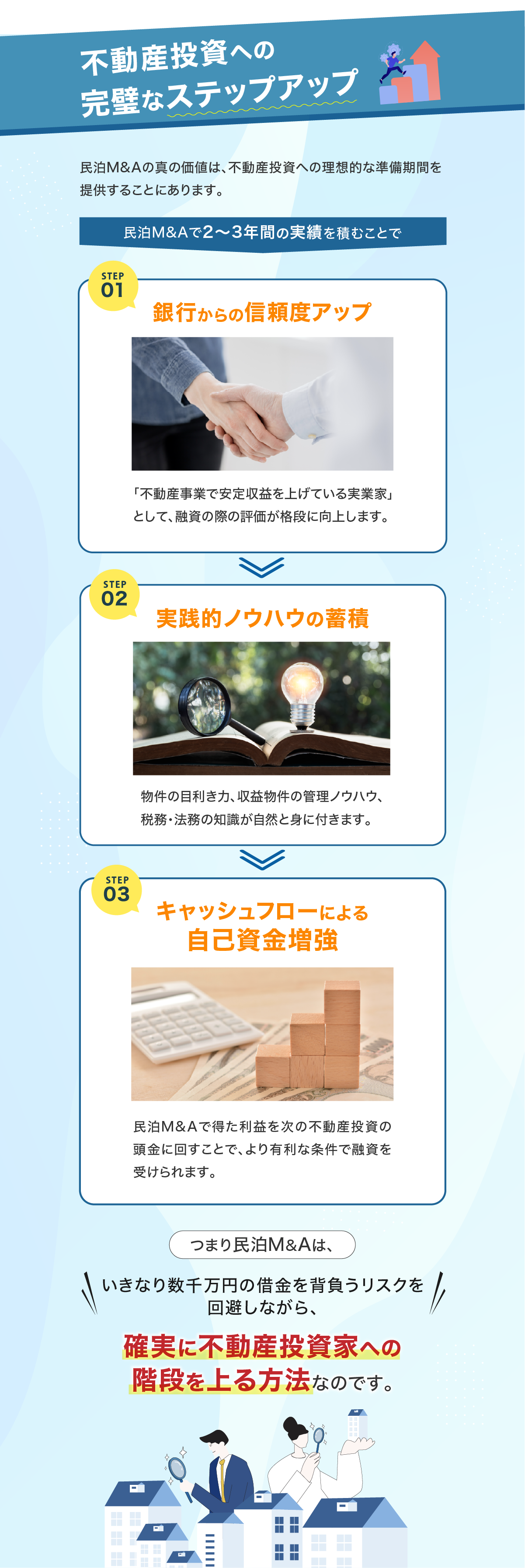 昨今の観光需要特需に目をつけ2棟目の購入を実行。田中先生のアドバイスで、300万円の自己資金で売上400万円の民泊を購入。100万円の利益。法人も建てることに。今後は、新設法人の与信を使った民泊買収を行っていく予定。