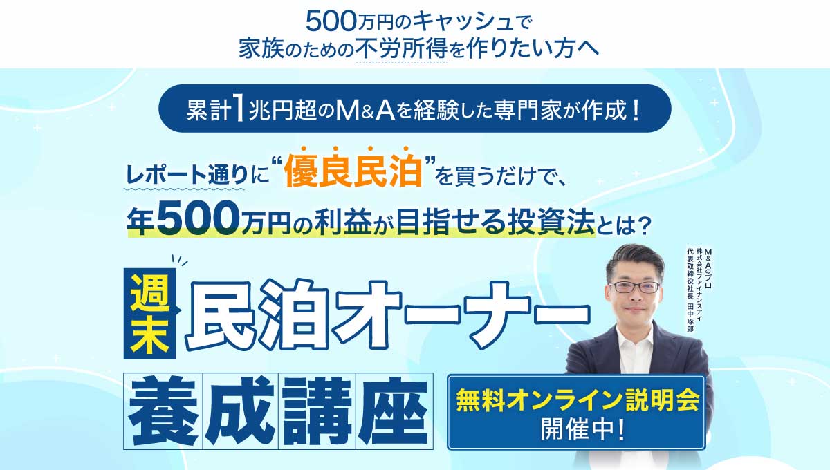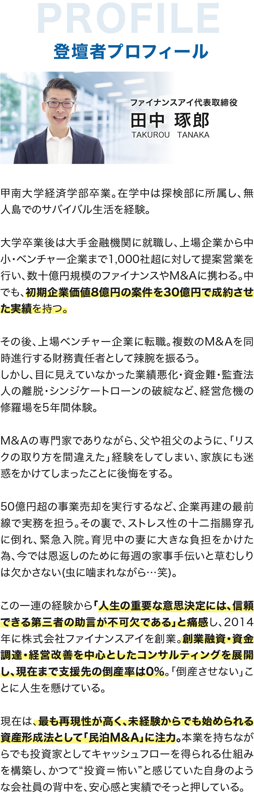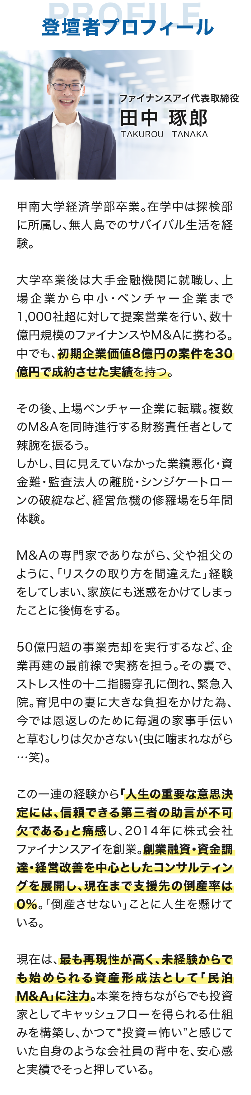 大手企業の会社員30代。資産運用をしたい。いずれ独立も考えていたところ、田中先生からのアドバイスを受けて、1200万円の自己資金で、たった2ヶ月でM&A成功。月30万円弱のインカムを得られるように。